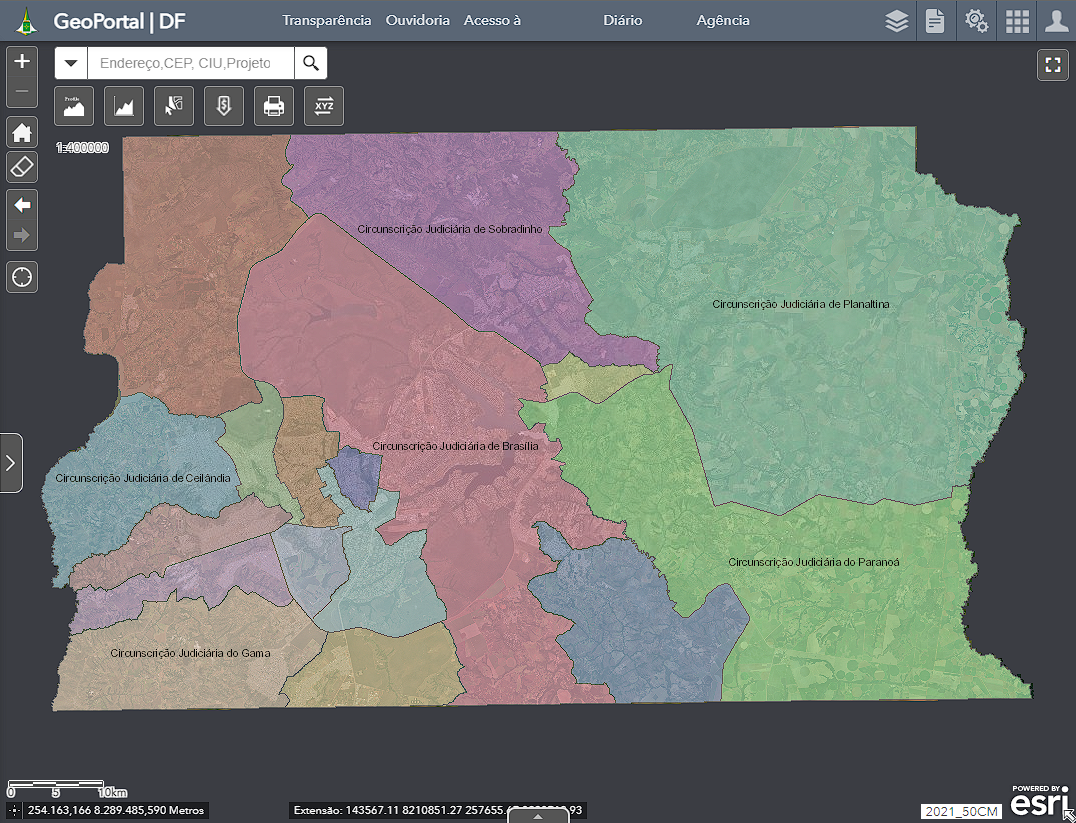 Mapa elaborado em 2014 e atualizado em 2023 em que mostra o limite das 17 unidades Judiciárias do Distrito Federal e suas dimensões territoriais.