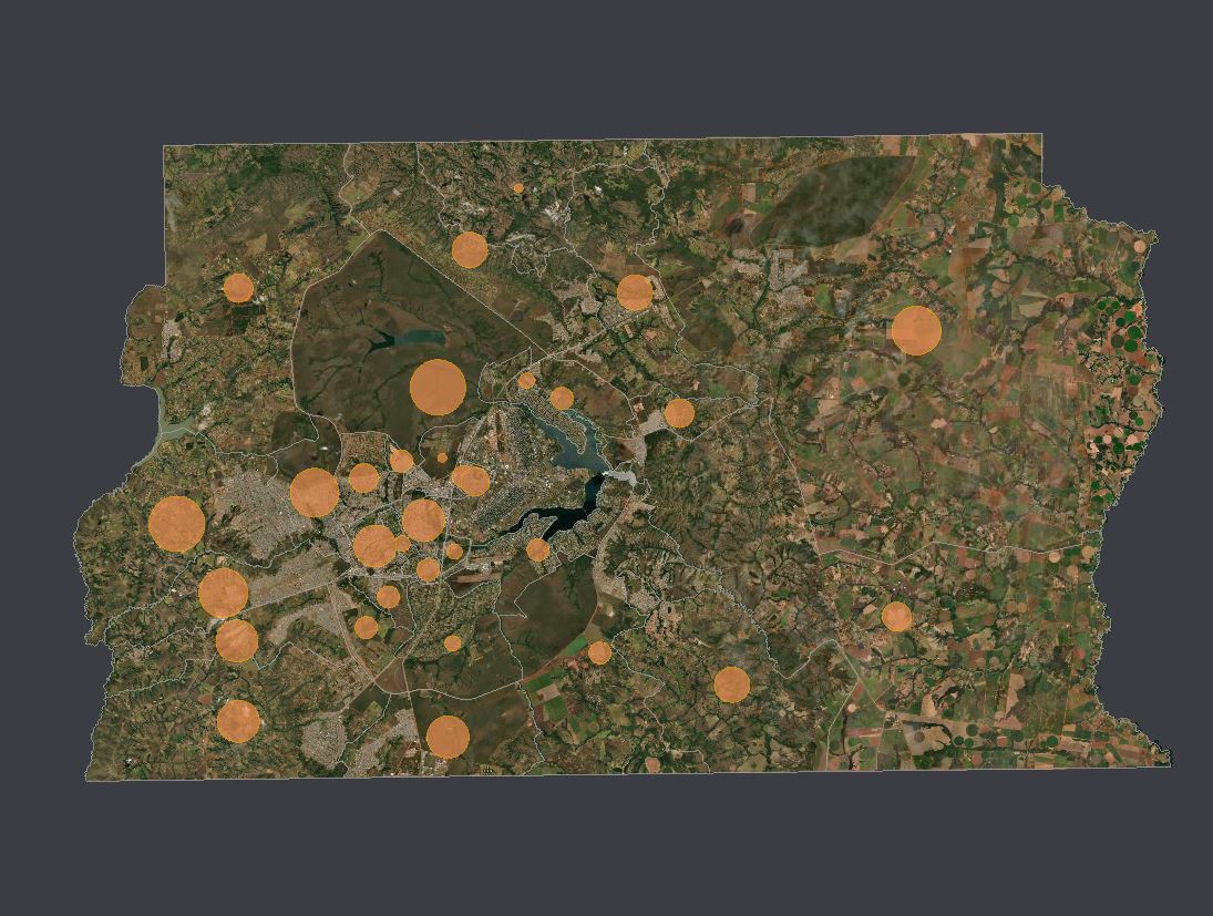Mapa apontando a população por Região Administrativa. Nesse plano de informação é possível obter informações sobre o código setor, tipo de setor, quantidade de mulheres, homens e a população total do setor.